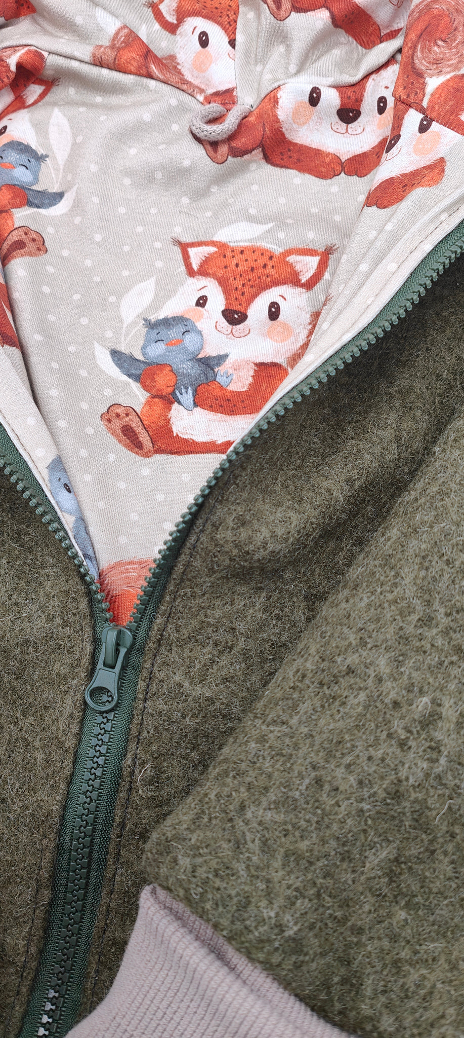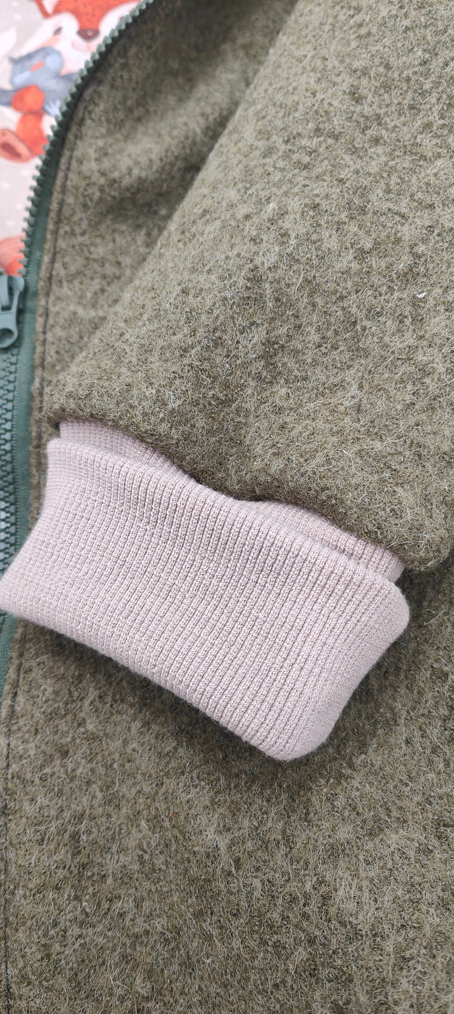 Da der Mantel aus Walk (100% Schurwolle) angefertigt wird, ist er temperaturregulierend. Er schirmt an kälteren Tagen super von der Kälte ab, verhindert jedoch auch das Schwitzen des Kindes an wärmeren Tagen. Gefüttert wird der Mantel mit dünnem Jersey. Dieser ist angenehm auf der Haut des Kindes.