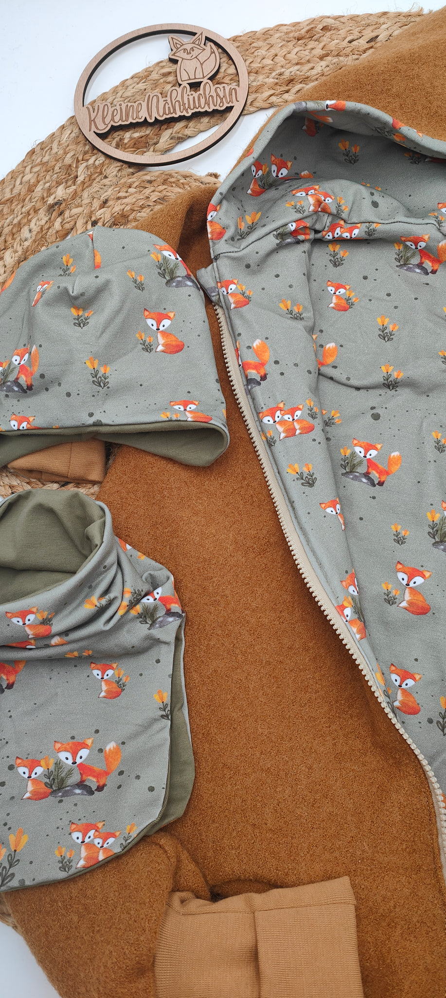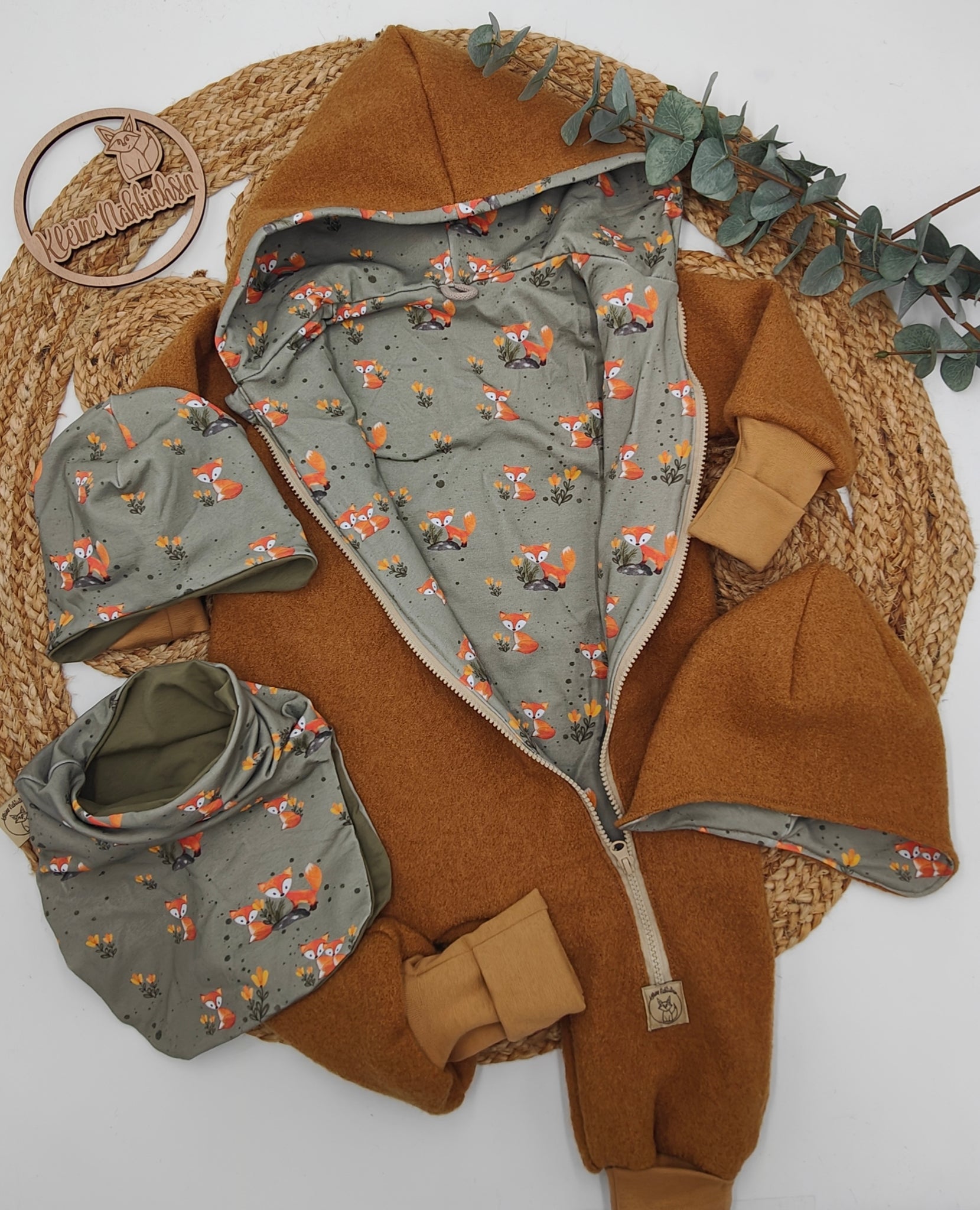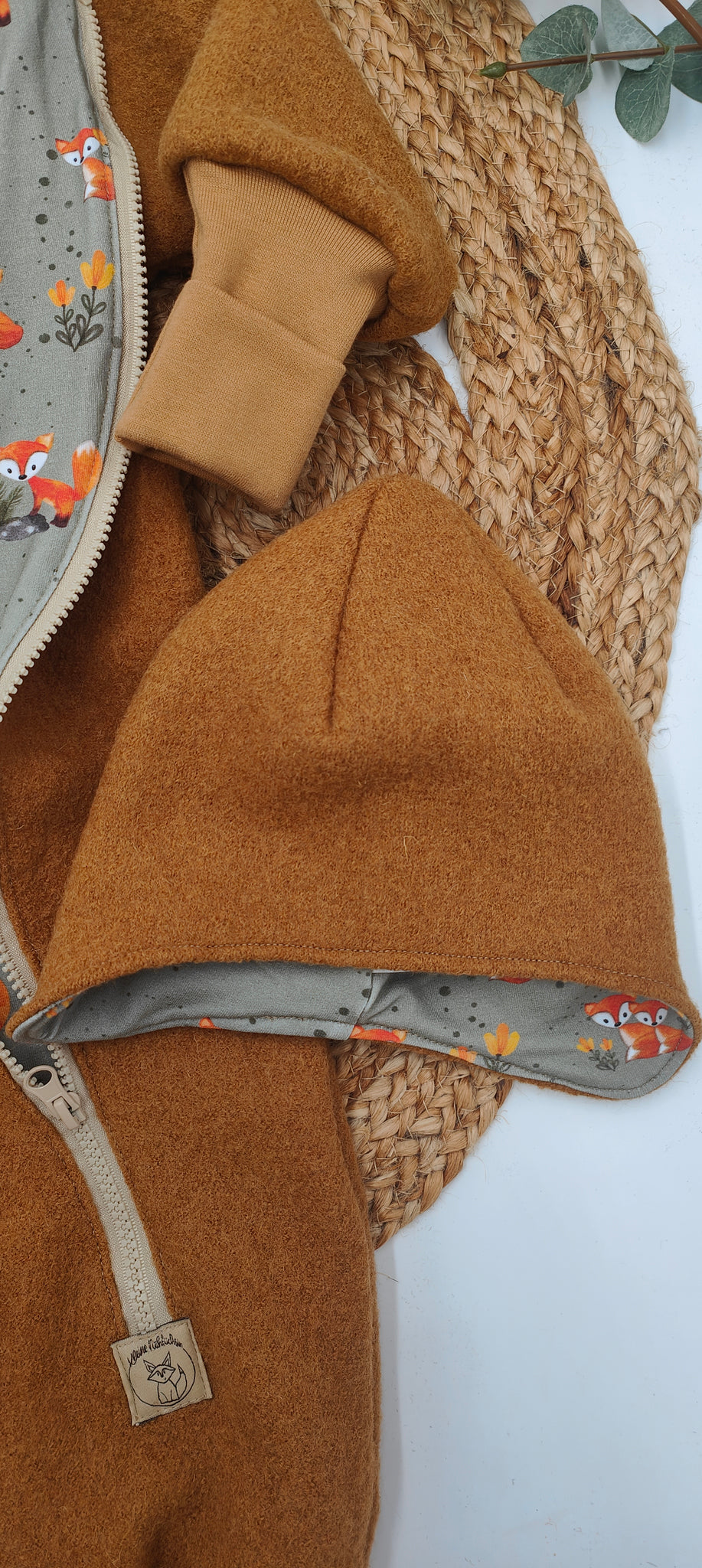 Da der Overall aus Walk (100% Schurwolle) angefertigt wird, ist er temperaturregulierend. Er schirmt an kälteren Tagen super von der Kälte ab, verhindert jedoch auch das Schwitzen des Kindes an wärmeren Tagen. Gefüttert wird der Overall mit dünnem Jersey. Dieser ist angenehm auf der Haut des Kindes.
