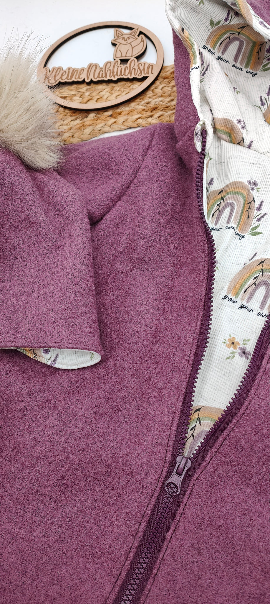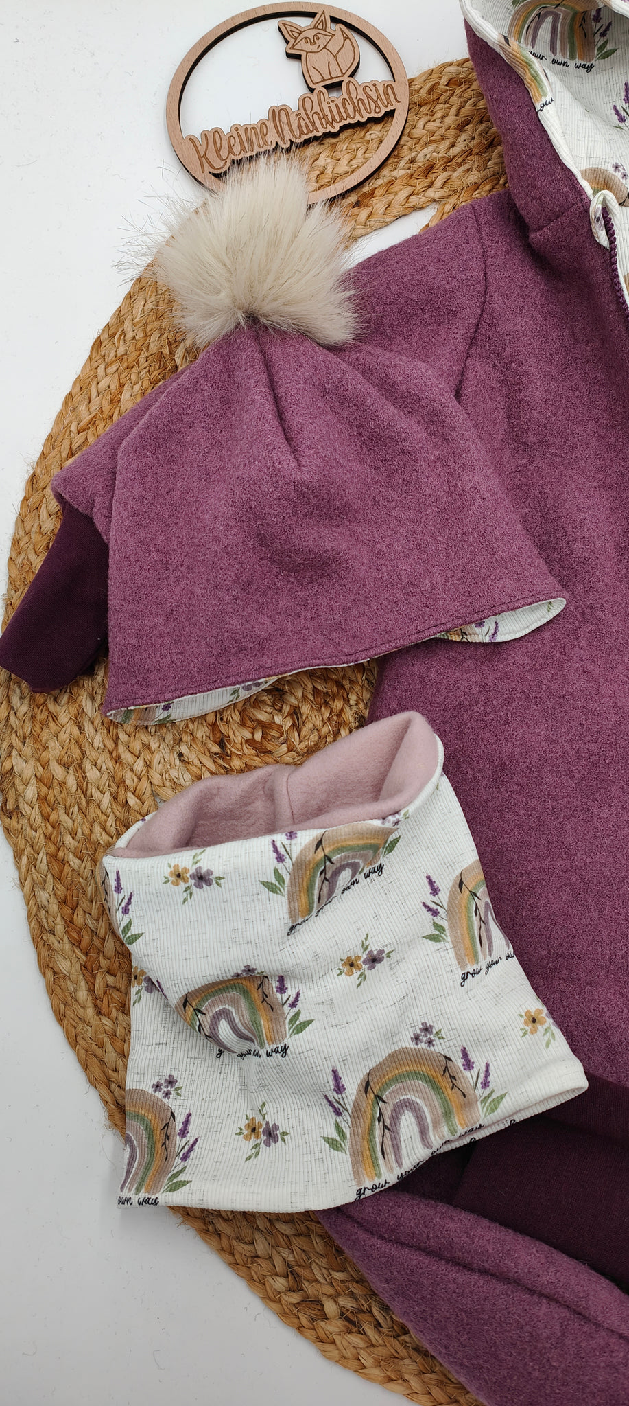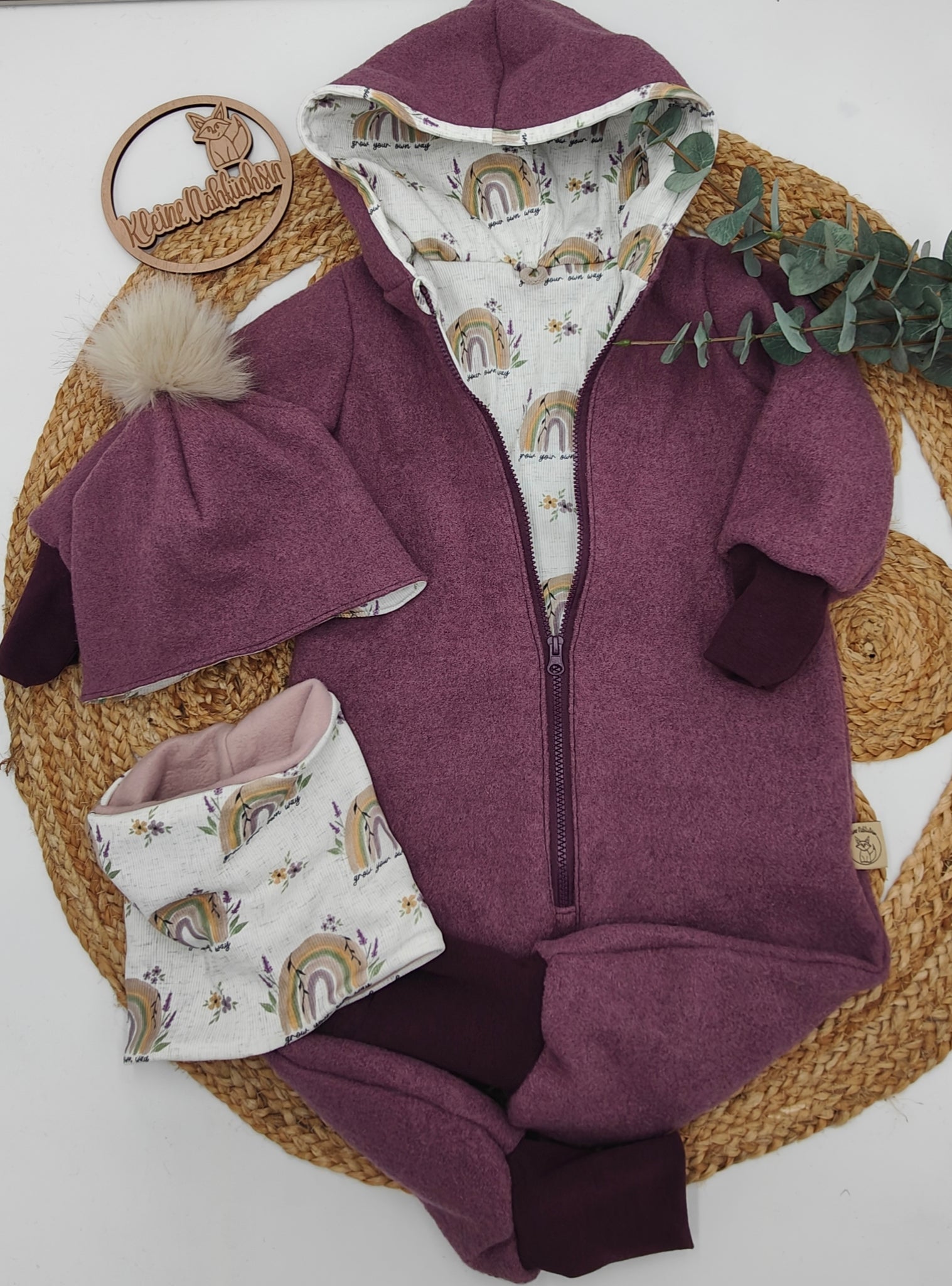 Da der Overall aus Walk (100% Schurwolle) angefertigt wird, ist er temperaturregulierend. Er schirmt an kälteren Tagen super von der Kälte ab, verhindert jedoch auch das Schwitzen des Kindes an wärmeren Tagen. Gefüttert wird der Overall mit dünnem Jersey. Dieser ist angenehm auf der Haut des Kindes.